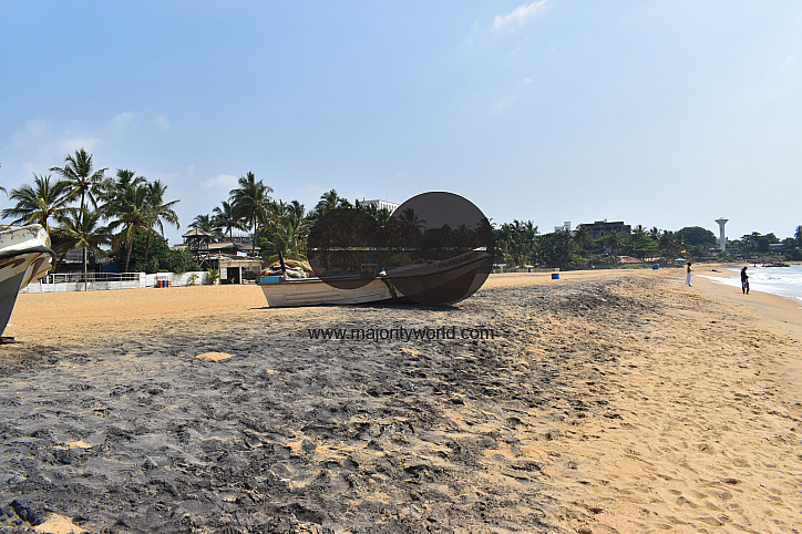 Boats stationed on shore at the Beach. Mount Lavinia Beach is the main sea-bathing spot in Colombo. The scenic beach offers a stretch of sand, waves, lifeguards, hotels & nearby restaurants. Colombo, Sri Lanka.