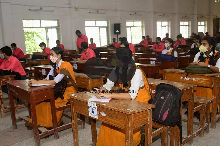 Students attending classes on the first day of school which opened after along break. The Tripura government has allowed schools to function with strict adherence to the guidelines issued by the Ministry of Health due to the coronavirus pandemic. Agartala, Tripura, India.