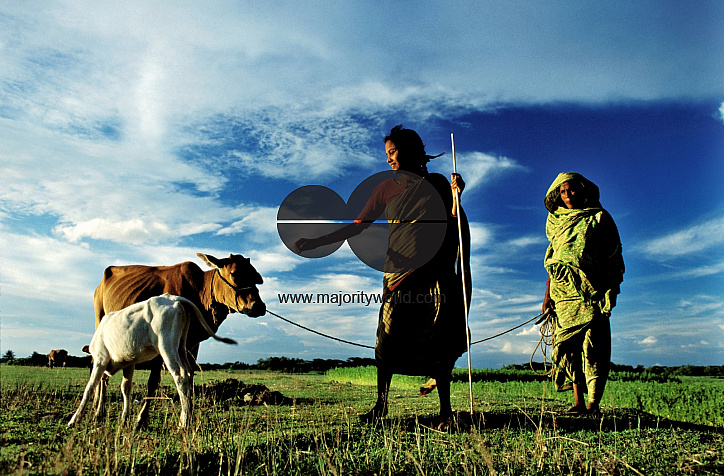 Women in green paddy fields and cows are a common rural scene. The late afternoon light is also common and known in Bangla literature as kone dekhano alo light to show off the bride in. Katiadi, Kishoreganj, Bangladesh. 1998.