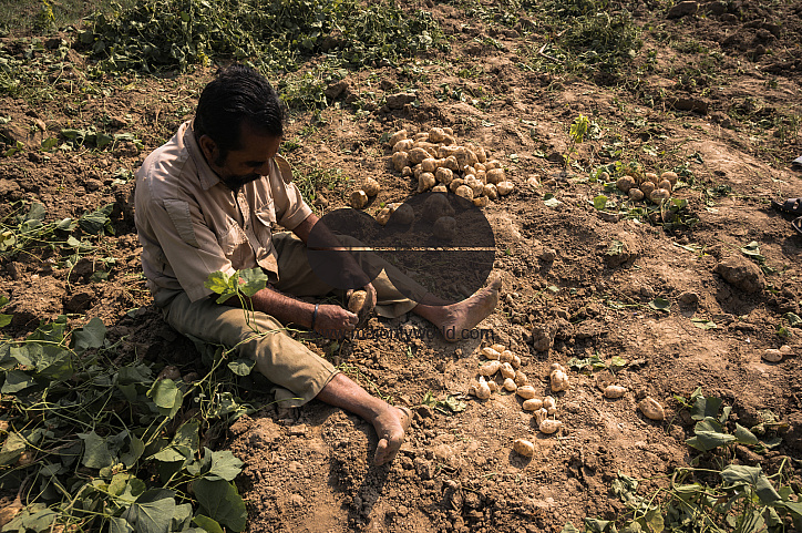 A farmer and his family is digging the cultivated soil and picking Jicama. Jicama, also known as yam bean, is a round, fleshy taproot vegetable or bean family plant. In India and Bangladesh, this tuber is popular as 'shank aloo' or shankalu. Jicama (Scientific name: Pachyrhizus erosus) is a perennial vine, growing vigorously under semitropical and tropical climates. Tehatta, Nadia, West Bengal, India.