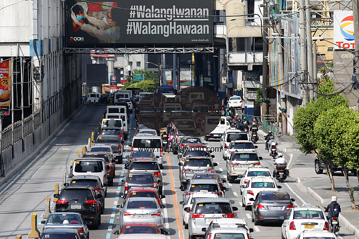 A billboard sign message #Walang Iwanan, #Walang Hawaan" (#NoOneLeftBehind #NoOneWillGetSick) flash during the morning traffic along EDSA. Metro Manila, Philippines.