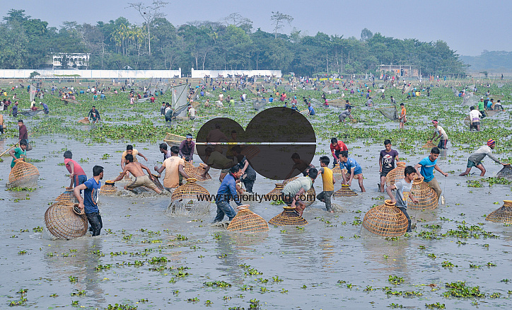 • Image Description: Polo Bawa Utshob, a 200 year old festival. Villagers gather with their traditional fishing nets and Polo made of bamboo and cane at a Beel for a Traditional fish catching festival which marks the start of the month Magh, the tenth month in the Bengali cal