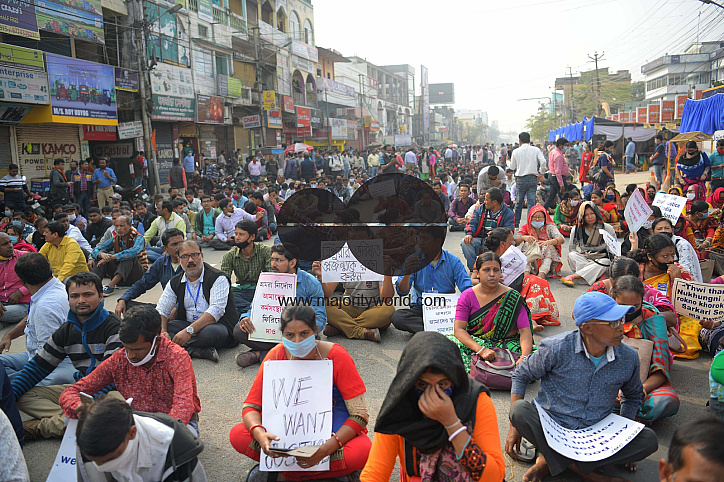 • Image Description: Terminated teachers are blocking roads and protesting because the Government has not given permission to bring the dead body of a female teacher who has committed suicide by consuming poison and poisoning her son as well. Agartala, Tripura, India.