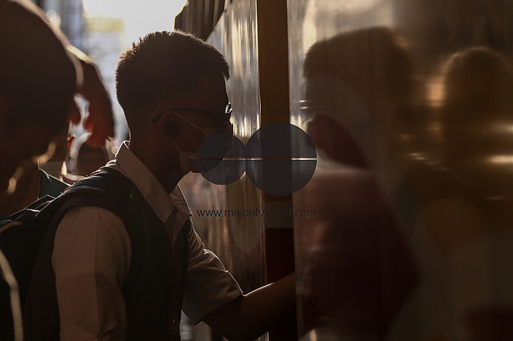 • Image Description: A student wears a protective face mask as a prevention method for the Coronavirus, waiting in line at a bus station. Quezon City, Philippines.