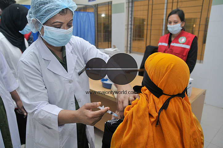 Sylhet, Bangladesh. 07th February 2021. The Coronavirus vaccinations on people began in Sylhet today. Medical staff inoculating the first dose of the Oxford-AstraZeneca vaccine by the Serum Institute of India at the Osmani Medical College and Hospital.