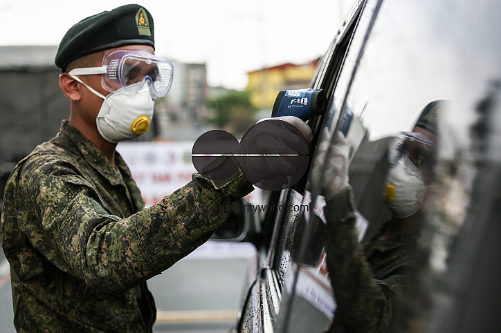 • Image Description: A policeman checks the body temperature and identification of a passenger on board his vehicle at a checkpoint after being deployed as part of the government’s preventive measure against the spread of coronavirus in Metropolitan Manila, Philippines.