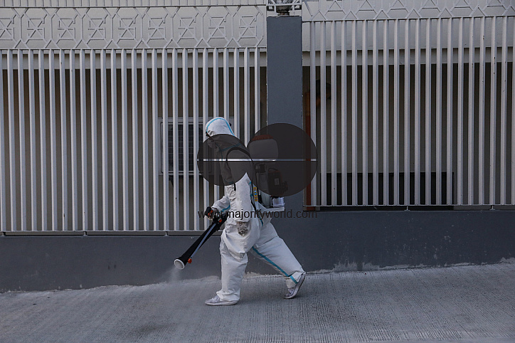 • Image Description: A sanitation worker disinfects along a street in San Juan City as a preventive measure against the spread of COVID-19. Several villages in the Philippine capital have been placed under 'extreme enhanced community quarantine' following the increase of conf