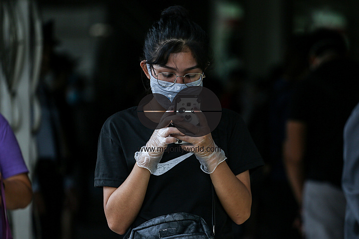 A woman wearing a protective mask uses plastic gloves while falling in line at a grocery store during the coronavirus lockdown. Thousands flock to groceries where strict social distancing is practiced to fight the spread of COVID-19. Quezon City, Philippines.