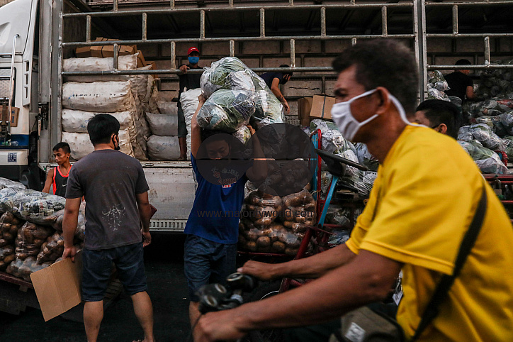 Workers unload sacks of vegetables from a truck outside a public market during a lockdown to fight the spread of COVID-19. The Philippine economy plunged into recession on as it grapples with surging coronavirus infections. Manila, Philippines.