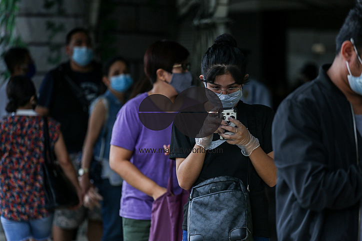 A woman wearing a protective mask uses plastic gloves while falling in line at a grocery store during the coronavirus lockdown. Thousands flock to groceries where strict social distancing is practiced to fight the spread of COVID-19. Quezon City, Philippi