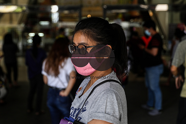 A woman wearing a protective mask uses plastic gloves while falling in line at a grocery store during the coronavirus lockdown. Thousands flock to groceries where strict social distancing is practiced to fight the spread of COVID-19. Quezon City, Philippi