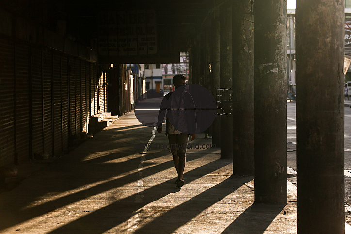 A man walks past closed shops during lockdow. Lockdown was declared by the government to fight the spread of the coronavirus in the country. Manila, Philippines.