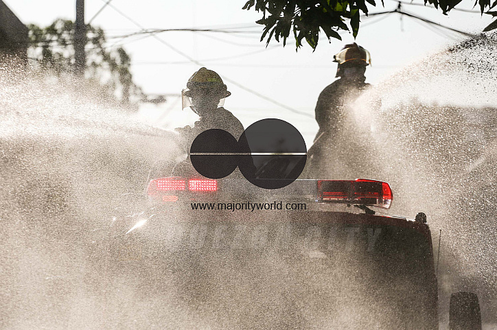 • Description: Fireman uses a hoses to spray disinfectant solution along a street to help curb the spread of COVID-19 during the coronavirus lockdown in Manila, Philippines.