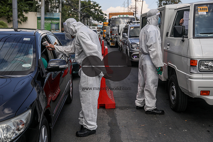 Filipino policemen wearing personal protective equipment (PPE) stop and inspect entering vehicles at a checkpoint during the coronavirus lockdown in Manila, Philippines.