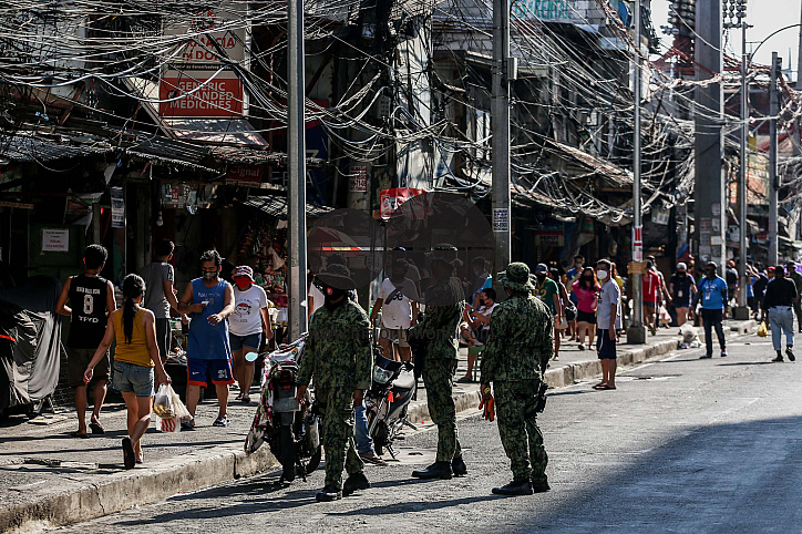 Filipino policemen stand along a street to check that enough social distance is maintained to slow the spread of the coronavirus during a lockdown in Manila, Philippines.