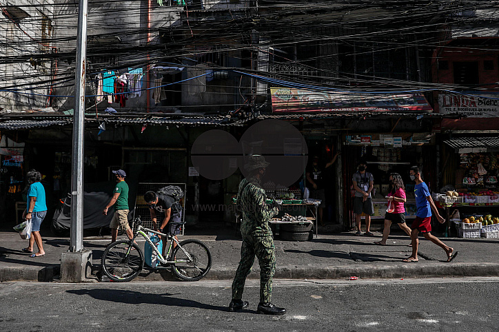A policeman stands along a street to check that enough social distance is maintained to slow the spread of the coronavirus during a lockdown in Manila, Philippines.