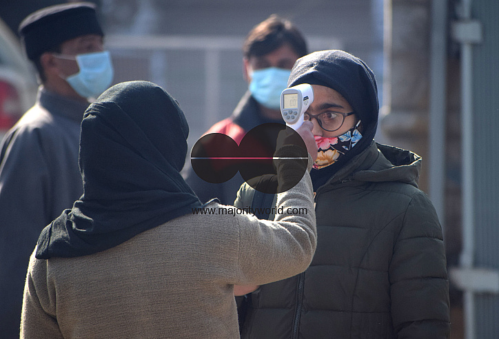 A college employee checks the temperature of a student. Colleges were closed due to the coronavirus. After 12 months colleges have reopened. Srinagar.