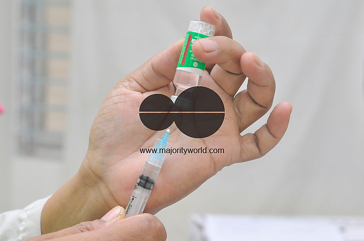 Medical staff prepares a syringe with a dose of the Oxford-Astrazeneca Covidshield vaccine by the Serum Institute of India at vaccination campaign at Dakhin Surma Upazila Health Complex, Vaccination Center , Dakhin Surma,Sylhet, Bangladesh