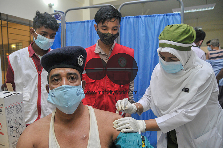 Health workers vaccinate a police officer during the first-stage coronavirus vaccination drive at MAG Osmani Medical College & Hospital- Vaccination Center, Syllhet, Bangladesh.