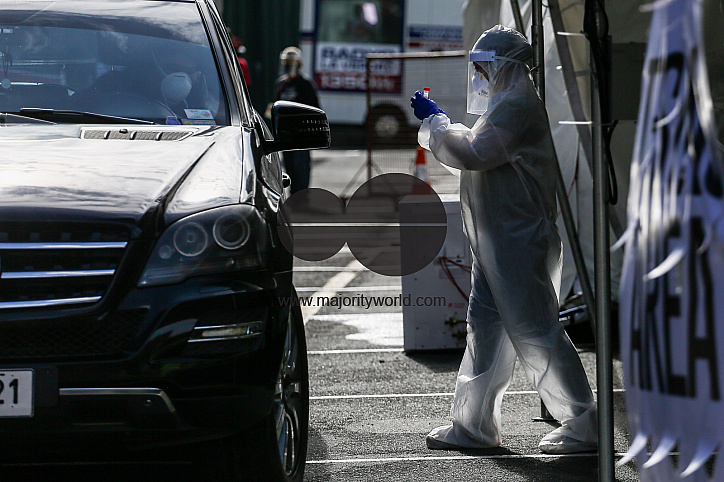 A medical worker holds Universal Transport Medium (UTM) tubes at a carpark turned into a drive-through coronavirus testing facility during the enhanced community quarantine in Taguig, Metro Manila, Philippines.