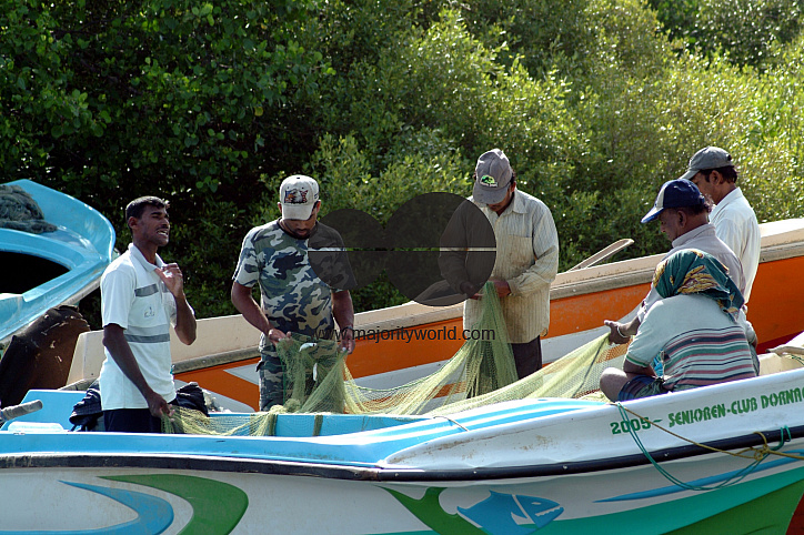 Group of fishermen preparing and checking fishing nets before going to the deep sea for fishing. The boats are ones with outboard motors and made of fiber glass. Negombo, Sri Lanka. July 9, 2005.