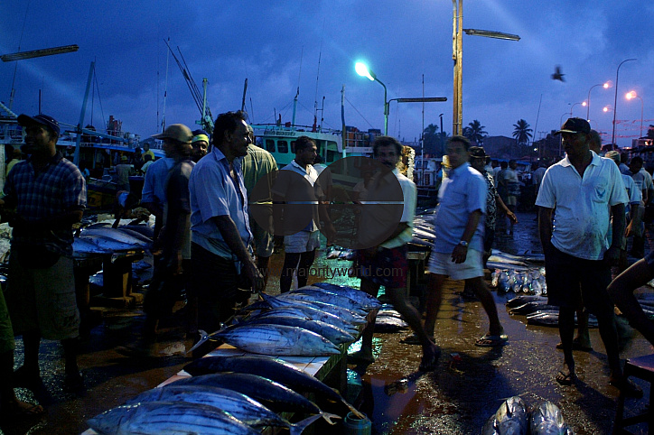 The fisheries harbor at Negombo is a hive of activity even before sunrise where sea fishes are unloaded and sold by auction. Sri Lanka. July 9, 2005.