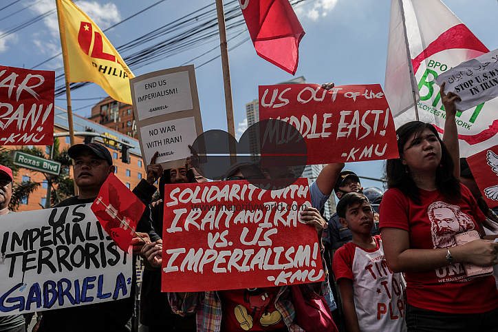 Filipino demonstrators protest against the US-led airstrike in Iran that killed a top Iranian military general, Qassem Soleimani, near the United States embassy in Manila, Philippines.