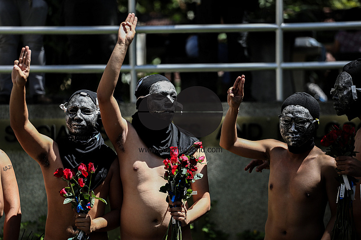 Masked fraternity students from the University of the Philippines pose during the "Oblation Run" or their traditional naked run at the Arts and Sciences building in Manila. The group of students call on the youth to act on the issues of climate change. Philippines.