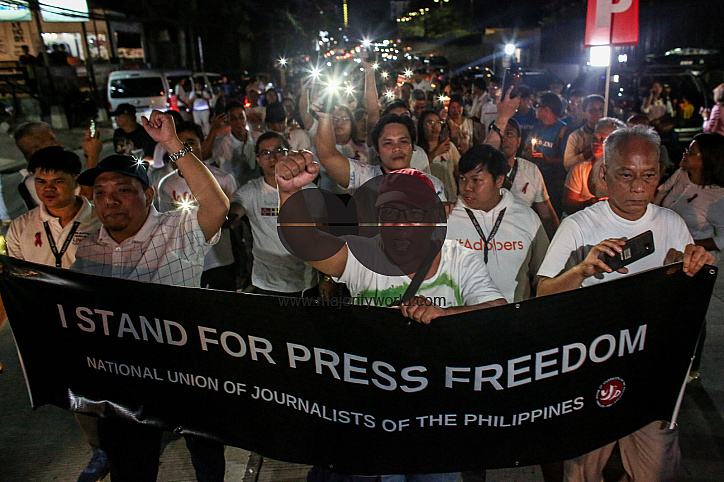 • Description: Supporters and employees of ABS-CBN, the country's largest broadcast network, light candles and shout slogans as they join a protest in front of the ABS-CBN building in Manila, Philippines.
