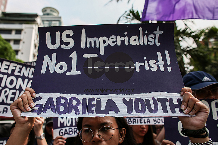 A woman raises a placard as activists from the Gabriela Youth group shout slogans as they protest in celebration of International Working Womenâs Day near the US embassy in Manila, Philippines.