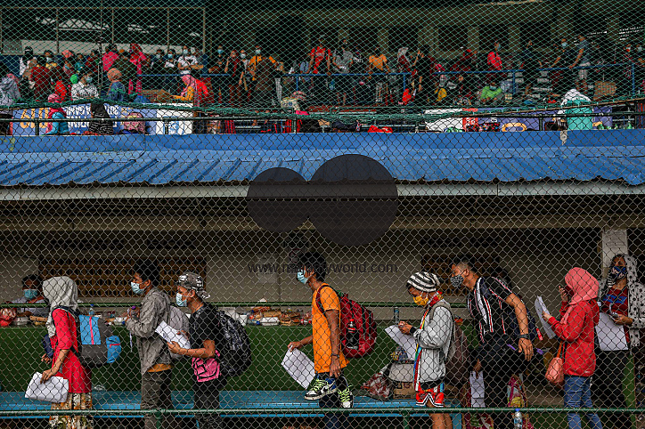 Filipinos wearing protective masks wait for their coronavirus rapid tests before returning to their provinces through a government's transportation assistance program at a sports stadium in Manila, Philippines.