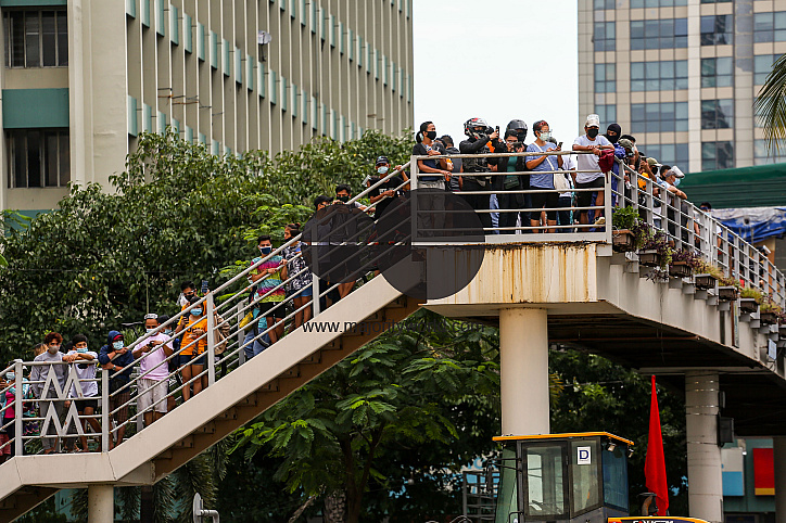 People take pictures on a footbridge as they flock to a portion of Manila baywalk area that was covered with crushed dolomite rocks amid rising coronavirus cases in Manila, Philippines.