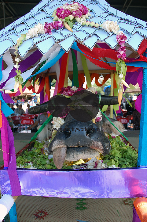 Head of a buffalo in a little-house, called 'Jodhang'. It will be thrown away as an offering in the south sea by the fishermen. Bantul, Yogyakarta, Indonesia. February 2, 2006. Once a year, fishermen in Samas Beach, Bantul, Yogyakarta send ritual offering