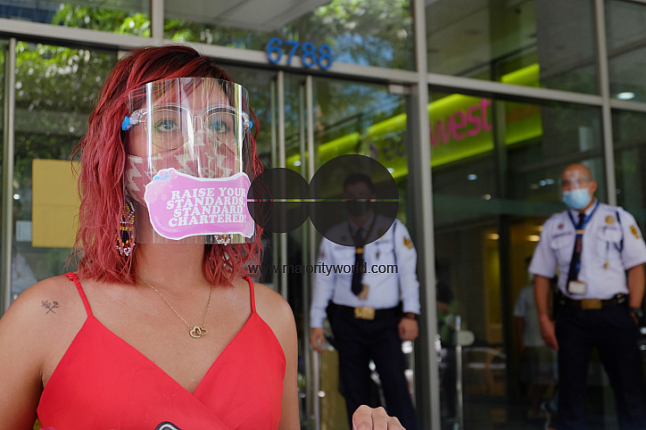 Climate activists held a giant cancelled cheque, as they protested in front of the Standard Chartered Bank in Makati City. They are calling for the bank to stop funding coal energy projects. Philippines.