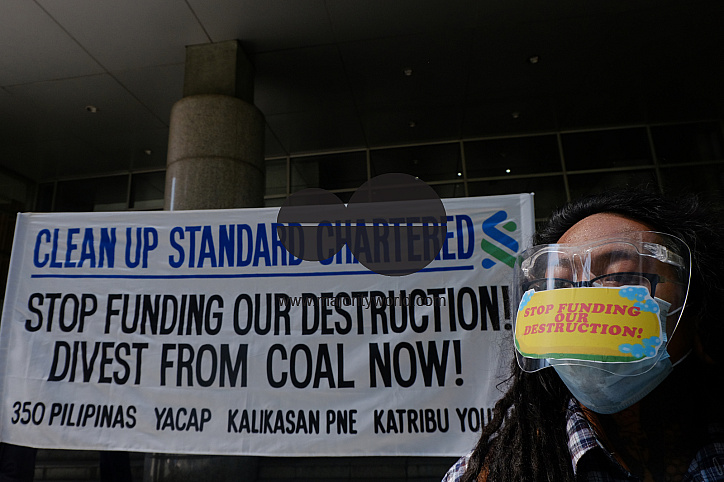 • Image Description: Climate activists held a giant cancelled cheque, as they protested in front of the Standard Chartered Bank in Makati City. They are calling for the bank to stop funding coal energy projects. Philippines.