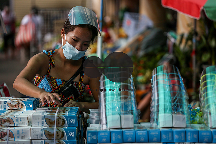 • Description: A vendor arranges boxes of face shields outside the Quiapo church nearly a year after Metro Manila was placed under a community quarantine to help fight the spread of the coronavirus. Philippines.