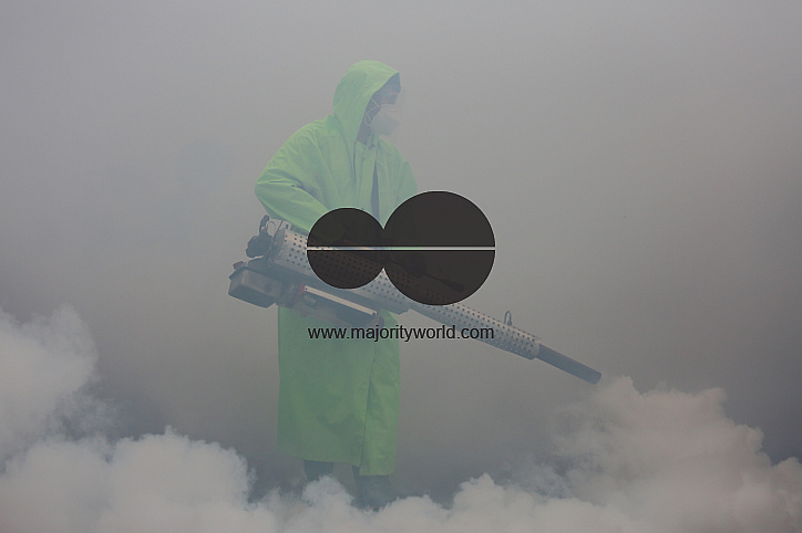 A worker disinfects a village as the Philippine capital marks a year under a community quarantine to help fight the spread of coronavirus. Philippines.