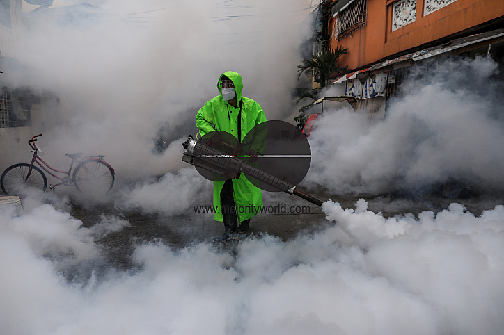 • Description: A sanitation worker fumigates inside a residential area as the Philippine capital marks a year under a community quarantine to help fight the spread of coronavirus. Philippines.