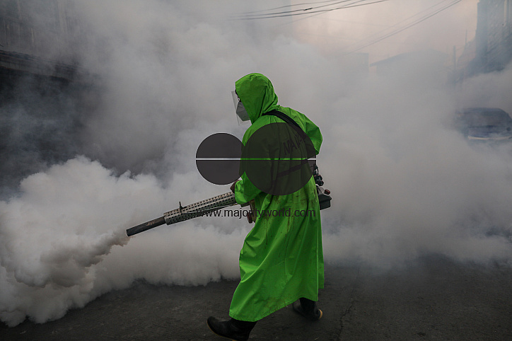 • Description: A sanitation worker fumigates inside a residential area as the Philippine capital marks a year under a community quarantine to help fight the spread of coronavirus. Philippines.