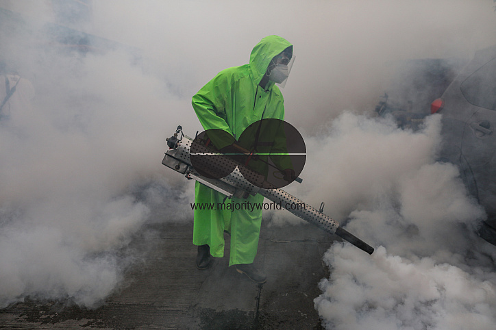 • Description: A sanitation worker fumigates inside a residential area as the Philippine capital marks a year under a community quarantine to help fight the spread of coronavirus. Philippines.
