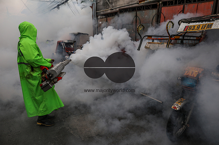 • Description: A sanitation worker fumigates inside a residential area as the Philippine capital marks a year under a community quarantine to help fight the spread of coronavirus. Philippines.