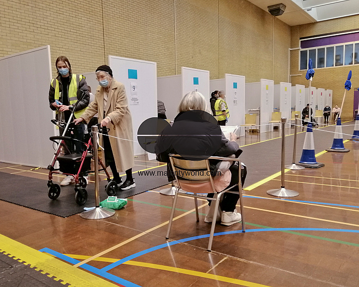 Senior citizens waiting to receive the first dose of the Pfizer Covid vaccine at a facility by the Royal Free Hospital in London, England, UK.