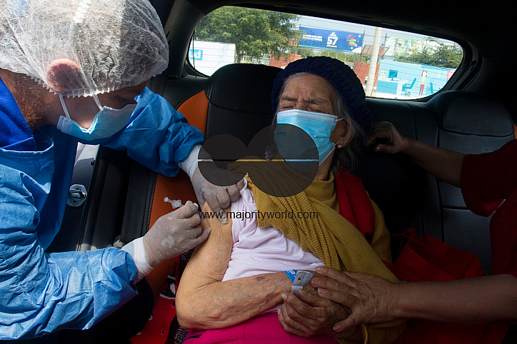 An elderly woman receives the first dose of the Pfizer vaccine against Covid-19 at the Vaccine Car Center Parque de las Leyendas. The Vaccine Car is a procedure in which people are vaccinated against Covid-19 inside their own cars. It was conceived in order to help the elderly, specially the ones who have difficulties to walk and mobilize. The Peruvian government has started the vaccination process beginning with people above 85 years of age. As of today 525,301 peruvians have been vaccinated against Covid-19. Lima, Perú.