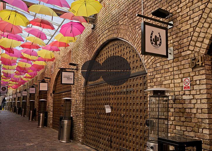 Shops in the world famous Camden Market closed, with some for sale and to let due to lockdown to prevent the spread of the Coronavirus pandemic in London, England, UK.