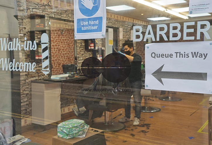 Barber and hairdresser shop reopened after lifting of lockdown restrictions due to the Coronavirus pandemic in Aberystwyth, Ceredigion, Wales, UK.