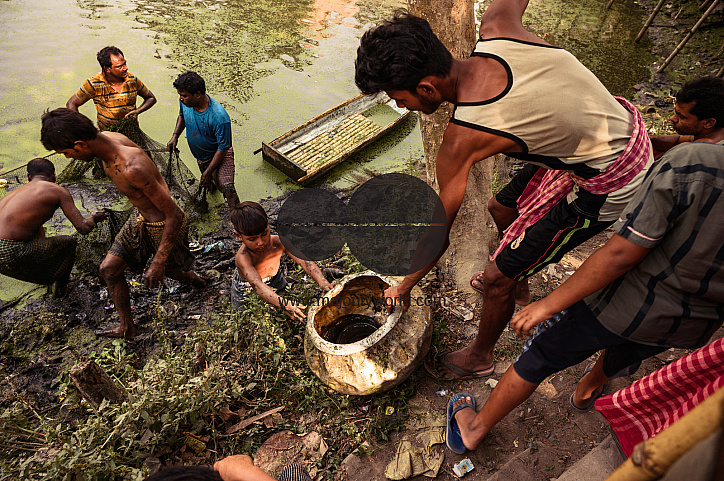 The rate of commercial catfish farming in India is increasing rapidly due to huge demand in the Indian Market. Villagers are catching catfish from the shallow dirty pond with a net. The fish will be sold in the local market the day before World Water Day.