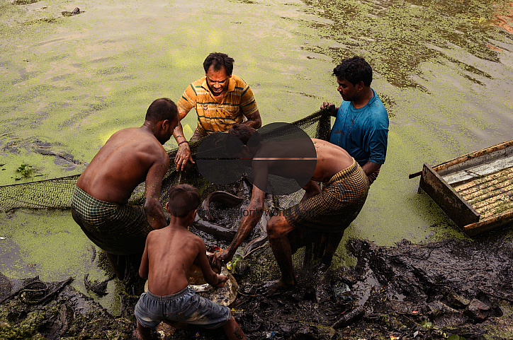 The rate of commercial catfish farming in India is increasing rapidly due to huge demand in the Indian Market. Villagers are catching catfish from the shallow dirty pond with a net. The fish will be sold in the local market the day before World Water Day.