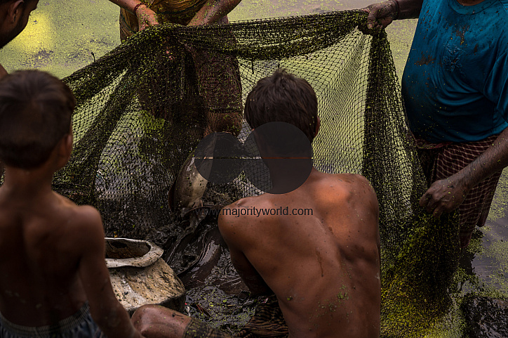 The rate of commercial catfish farming in India is increasing rapidly due to huge demand in the Indian Market. Villagers are catching catfish from the shallow dirty pond with a net. The fish will be sold in the local market the day before World Water Day.