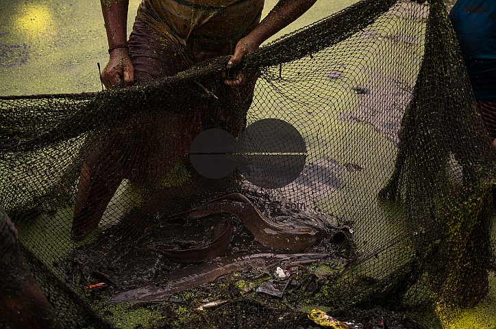 The rate of commercial catfish farming in India is increasing rapidly due to huge demand in the Indian Market. Villagers are catching catfish from the shallow dirty pond with a net. The fish will be sold in the local market the day before World Water Day.