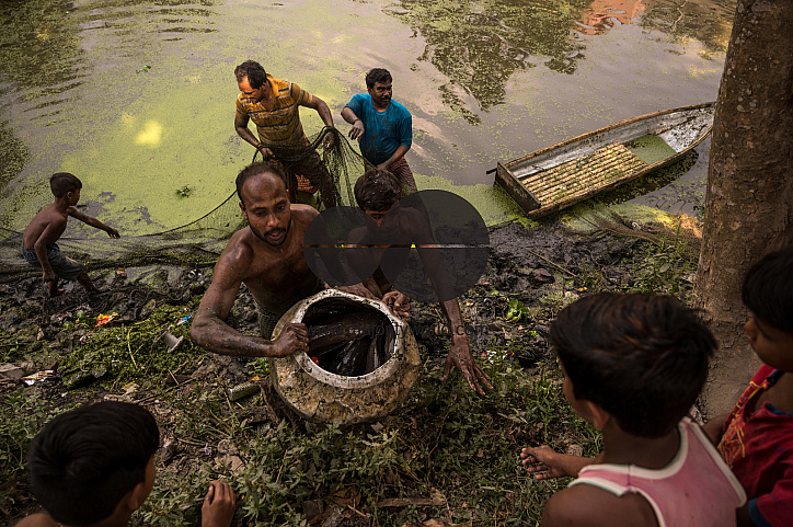 The rate of commercial catfish farming in India is increasing rapidly due to huge demand in the Indian Market. Villagers are catching catfish from the shallow dirty pond with a net. The fish will be sold in the local market the day before World Water Day.
